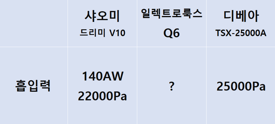 일렉트로룩스는 흡입력을 따로 표기 하지 않았습니다. 드리미V9와 비교한 영상에서도 흡입력이 뒤지는 것으로 보아 100W 미만의 제품으로 판단됩니다. 디베아 제품은 25000Pa로 약 160AW와트 정도가 되지 않을까 생각됩니다.